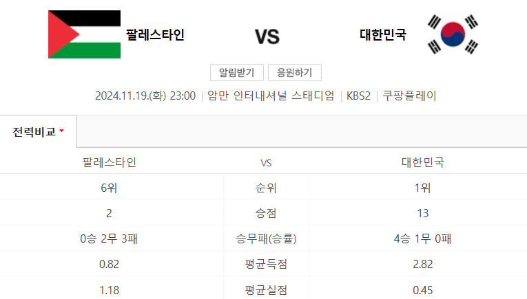 한국과 팔레스타인의 경기는 오후11시에 진행되며 TV 모바일로 시청하실수 있습니다. TV 중계 채널은 KBS2에서 시청하실수 있으며 모바일OTT 서비스는 쿠팡플레이를 통해서 시청해보실수 있습니다.