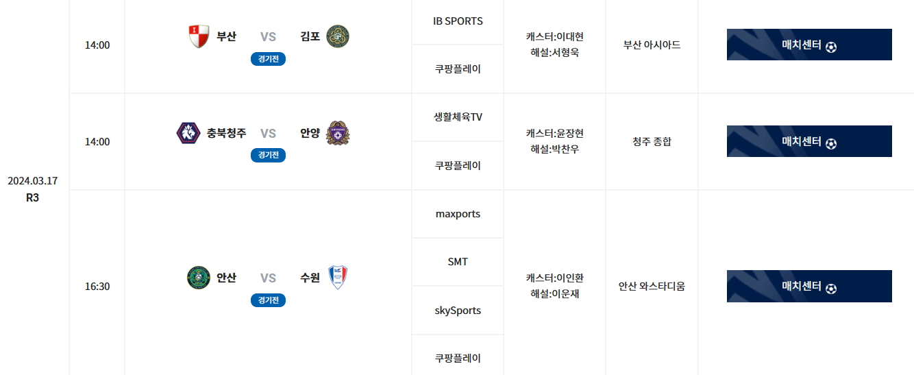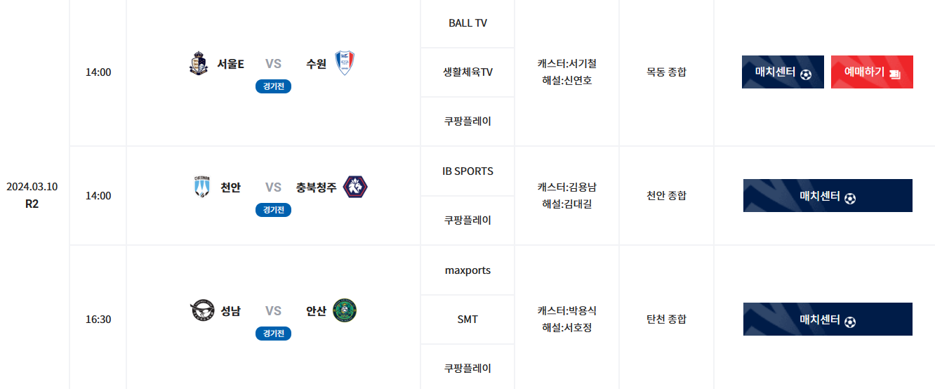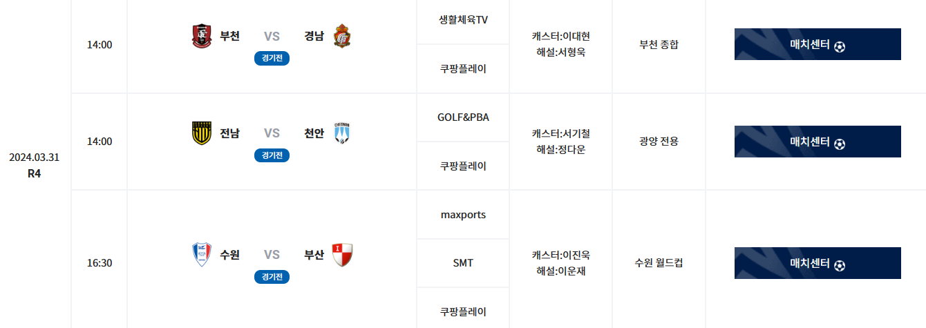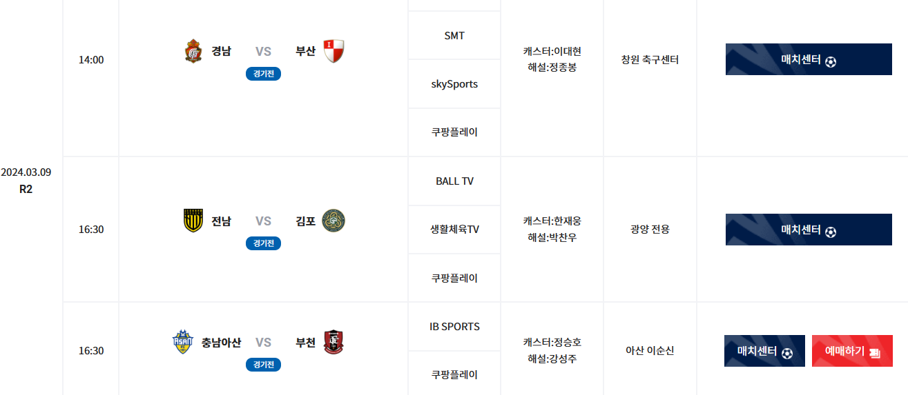 | 날짜 | 시간 | 매치센터 | 중계방송사 | 중계진 | 경기장소 | |